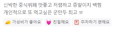 음식이 맛있다는 고객리뷰가 가장 많았고 가성비에서 뛰어나다는 평을 받고 있습니다.