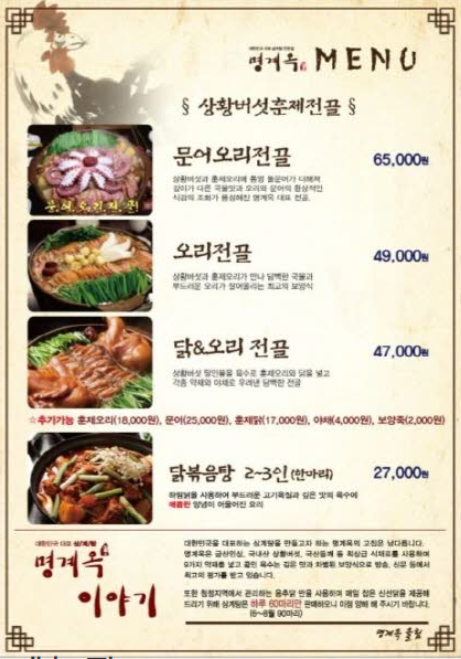 명계옥의 주 메뉴는 상황버섯 오리 전골과 삼계탕입니다.